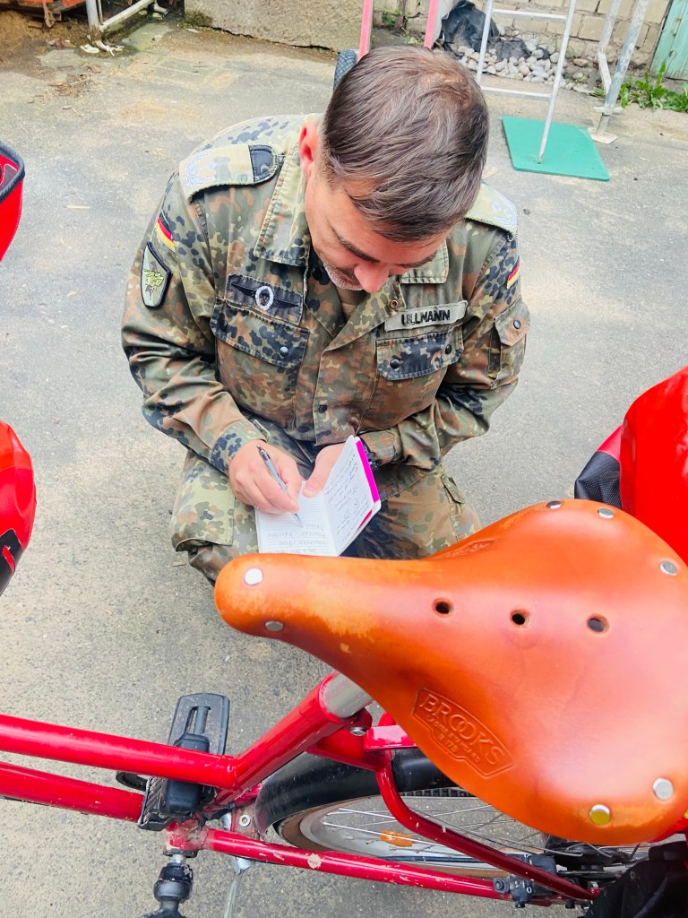 Fanns ingen campingplats o inget hotell när dagen började ta slut. Då rycker tysk militär ut o kör före mig med bil till bästa ”hippie-kollektivet” där jag får bo. Han frågar om han ska sätta på sirenen – ”yes” säger jag, men det blev ingen siren 😁.