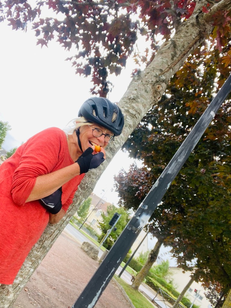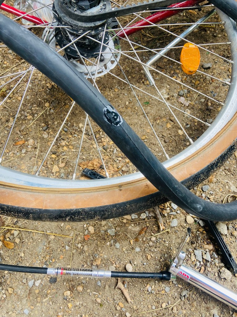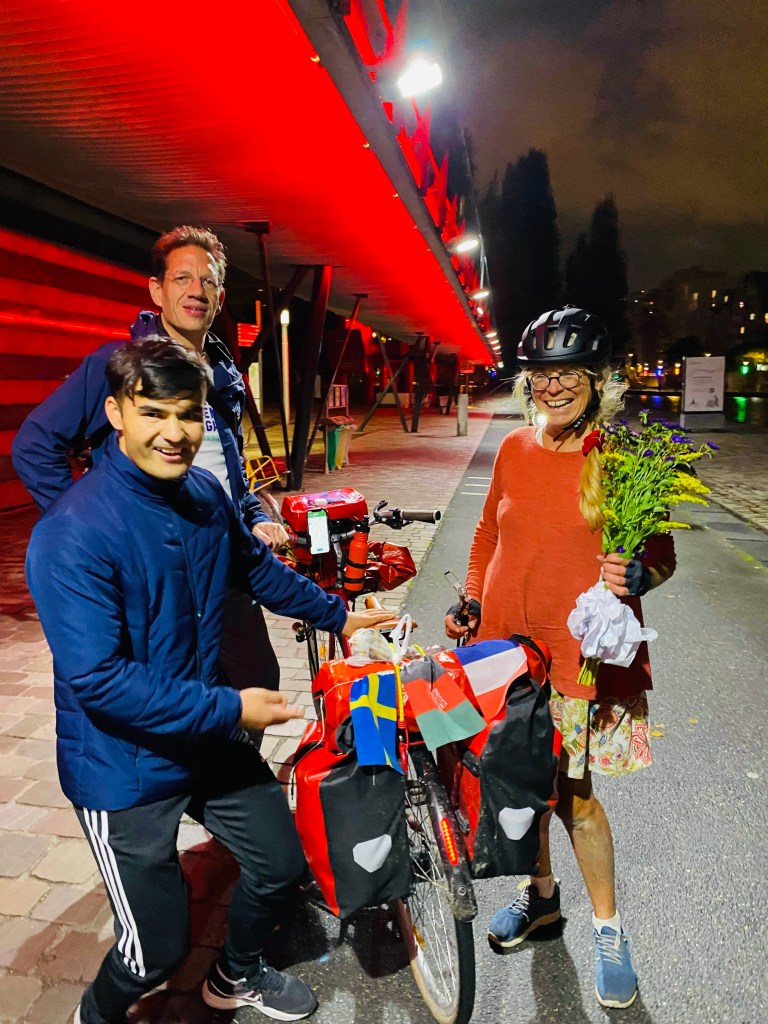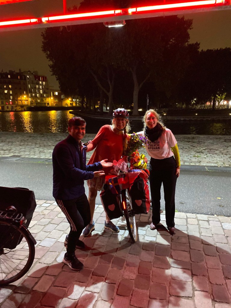 Mottagnings kommittén fick vänta lite då jag hade både punka o eviga pyspunkor sista två milen . Tack Aurelia, Renaud, Taqi ❤️Så underbart häftigt att komma fram – ena sekunder mekar jag punka o cyklar på små skogsvägar – nästa sekund på stadens trottoar Framme !!Taqi o Renaud fick också pumpa min pyspunka några gånger för att jag skulle komma ända fram till Aurelias goda soppa, en varm dusch och framförallt en bäddad säng. Så himla härligt ! Vänner är det bästa som finns ! Igår hann jag inte koka den vanliga gröten, var lite tidspress – så det blev plommon o bananer istället Börjar bli bra på att laga punka , men nu måste jag byta hela slangen och det får jag göra en annan dag ….5 mil från Paris var det grov grusväg att hoppa fram på, i snålblåst modell hemma 4 mil från Paris var vögen så här 3 mil från Paris